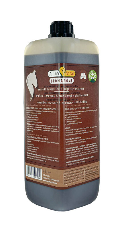 BRONAROME-siroop van ANIMAVITAL bevat een uitgekiende combinatie van essentiële oliën voor een optimale verzorging van de luchtwegen bij paarden in koude en vochtige periodes. Met Oregano (Oreganum vulgare) en Kaneelschors (Cinnamomum verum) bevat BRONAROME twee essentiële oliën die het weerstandsvermogen versterken. Hun werking wordt afgerond door de essentiële olie van Niaouli (Melaleuca viridifl ora) en Eucalyptus smithii, die helpen vrijer te ademen en de prikkel in de keel verzachten.
